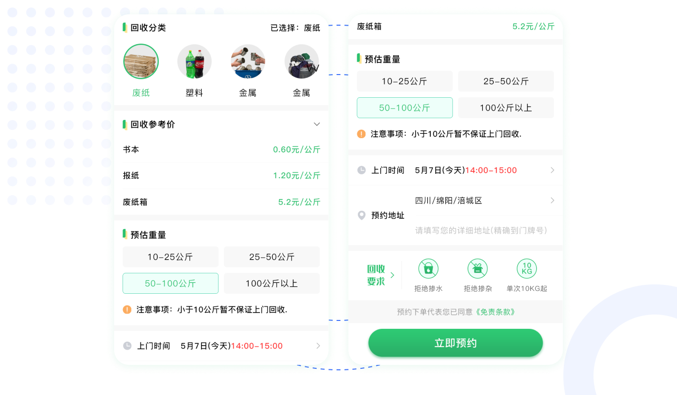 用戶出售垃圾廢品換錢的同時(shí)享受積分,積分可以兌換商品,增加用戶的使用黏性。