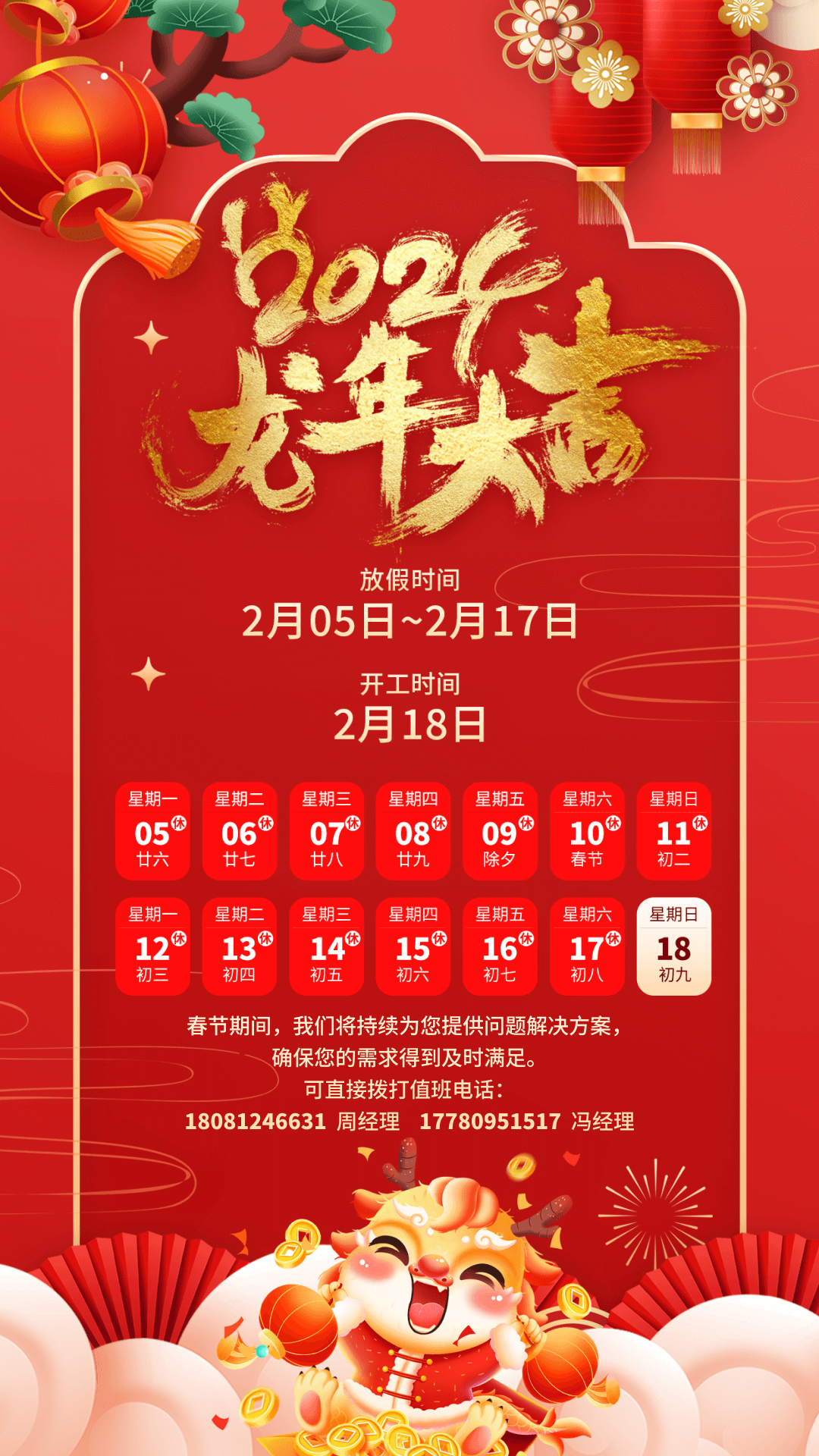 2024年新春佳節(jié)將至,根據(jù)國(guó)家的法定節(jié)假日規(guī)定及結(jié)合本公司實(shí)際情況,現(xiàn)將2024年春節(jié)放假時(shí)間作如下安排: