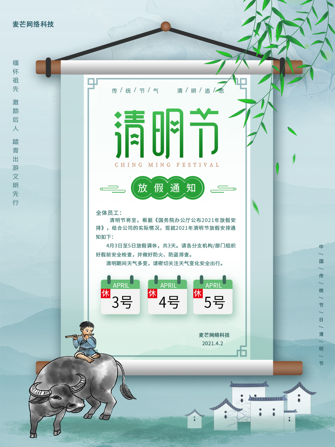 根據(jù)國(guó)務(wù)院辦公廳通知精神,我司現(xiàn)將2021年清明節(jié)放假安排通知如下: