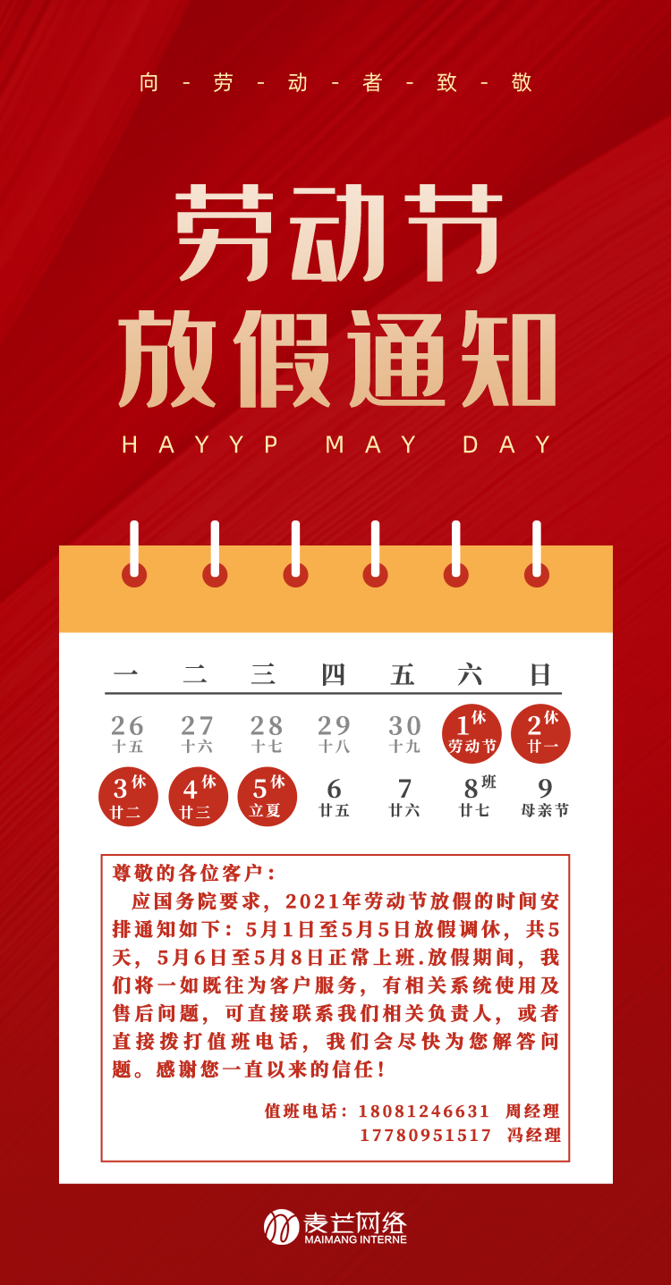 根據(jù)《國務(wù)院辦公廳關(guān)于2021年部分節(jié)假日安排的通知》精神,現(xiàn)將我司2021年勞動節(jié)放假的時間安排通知如下: