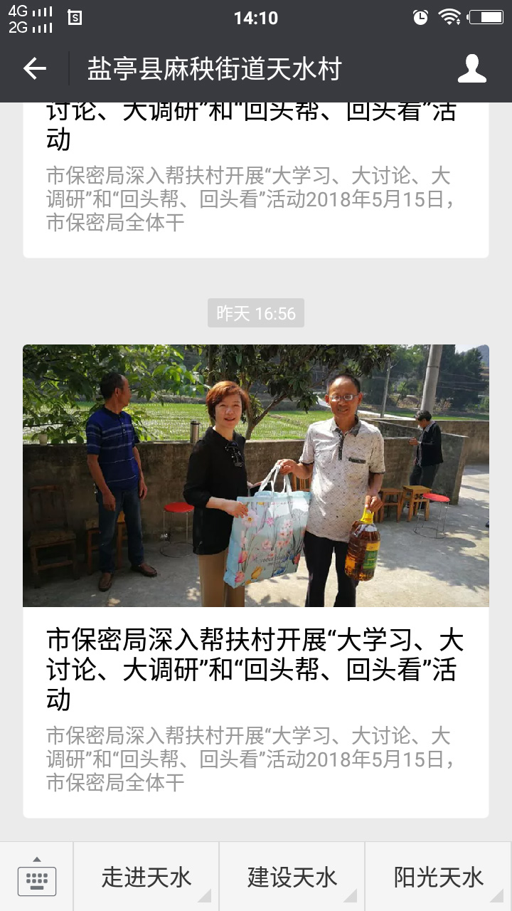 全村幅員面積3.4平方公里,耕地943畝、林地2950畝。轄9個村民小組,2017年底,共有426戶1057人。2014年被確定為省定貧困村,全村建檔立卡貧困戶63戶151人,貧困發生率達14.3%。2014年至今,在綿陽市環境保護局、綿陽市保密局、鹽亭縣環境保護局等部門的對口幫扶下,天水村聚焦“算得攏的收入、看得到的變化、靠得住的保障、掙得到的能力、信得過的認可”分戶施策,精準發力,充分運用好各項扶持政策,按照“六個精準”“五個一批”的總體要求,圍繞“一水二路三產業”的脫貧思路,在基礎設施建設、產業發展、公共配套設施的提檔升級,在群眾增收上找路子,在產業發展中求突破,措施得力,成效明顯,2017年底成功摘帽,實現整村脫貧。
